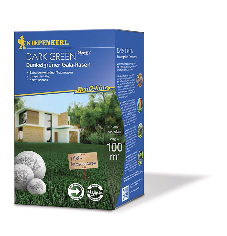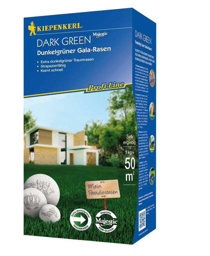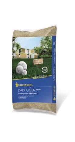 Die innovative Rasenmischung Kiepenkerl Profi-Line Rasen ‚Dark Green‘ enthält ausgewählte Gräser, die in unabhängigen Testungen Bestnoten erhalten haben. Das Besondere an dieser Mischung ist, dass Sie sich über einen Rasen von unbestechlicher, dunkelgrüner Rasenfarbe freuen dürfen. Das Rasensaatgut der Mischung ‚Dark Green‘ ist sehr keimstark, sodass Sie nicht lange auf Ihren Traumrasen warten müssen. Bei feuchter Witterung an einem sonnigen bis halbschattigen Standort ausgesät, keimen die Rasensamen ab einer Keimtemperatur von 10 °C. Diese speziell gezüchteten Rasengräser sind ideal geeignet für eine Rasenneuanlage. Rasenfans schätzen vor allem die dichte und extra dunkelgrünen Rasennarbe, die diese Rasenmischung hervorbringt. Doch nicht nur über eine gesunde Farbe können Sie sich freuen: Das kräftige Gräserwachstum von ‚Dark Green‘ lässt eine grüne Oase entstehen, die zum Verweilen einlädt. Dadurch, dass sich eine dichte Rasennarbe bildet, wird der Rasen zum einen vor Unkräutern und Moos geschützt. Zum anderen federt diese sportiven Aktivitäten und andere Belastungen ab, sodass Sie den strapazierfähigen Rasen gerne fordern dürfen. Durch die geringe Aussaatmenge von 20 g/m² können Sie eine Fläche von ca. 50 m² mit der Saatgutmenge 1 kg anlegen.