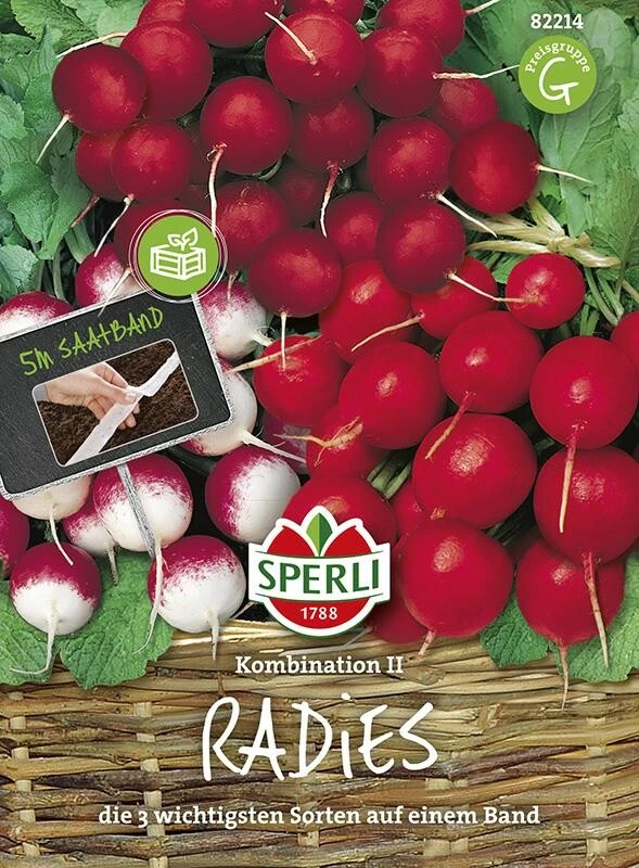 Die „Radies Kombination II“ setzt sich aus den drei Sorten ‚Riesenbutter‘, ‚Parat‘ und ‚Rundes halbrot-halbweiß‘ zusammen. ‚Riesenbutter‘ bildet runde, große Knollen, sehr kräftiges Laub und hat eine geringe Neigung zur Pelzigkeit. ‚Parat‘ ist ein Radies, das nicht pelzig wird. Die Knollen sind groß, besonders festfleischig und mit dünner karminroter Schale. ‚Rundes halbrot-halbweiß‘ ist eine zweifarbige, mittelstark wachsende, runde Sorte. Alle drei Sorten können dank des praktischen Saatbandes im Handumdrehen ausgesät werden. Die Erntezeit fällt in die Monate Mai bis Oktober.
