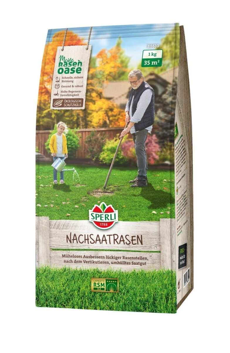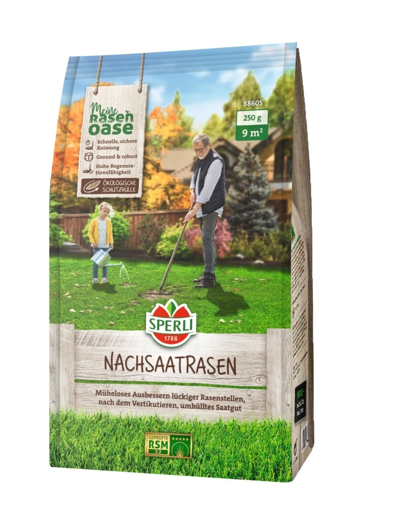 SPERLI’s Nachsaatrasen RSM 3.2 ist eine besondere Rasenmischung zur Beseitigung lückenhafter Stellen im Rasen. So können mühelos Rasenschäden durch z.B. Maulwürfe, Rasenkrankheiten oder starke Belastungen ausgebessert werden. Die Mischung eignet sich ebenfalls zur Rasenregeneration nach dem Vertikutieren. Ökologische Schutzhülle: Jedes Saatkorn ist mit einer 50 % Hüllmasse umschlossen. Die Hülle ist nach FiBL-ökozertifiziert. Sie speichert Wasser, sorgt für eine sichere und gleichmäßige Keimung sowie ein gutes Streuverhalten – einfache Handhabung. Das Saatgut bleibt gesund und vital. Geprüfte RSM 3.2: RSM = Regel-Saatgut-Mischung Diese Mischung ist für einen speziellen Verwendungszweck und nach den Vorgaben der FLL hergestellt worden. Die Gräser und deren Mischungsverhältnisse unterliegen strengen staatlichen Kontrollen und werden nach festgelegten Standards bewertet. Dies gewährleistet, dass in Saatgut mit dem Prädikat „RSM“ nur hochwertige Rasensamen enthalten sind.