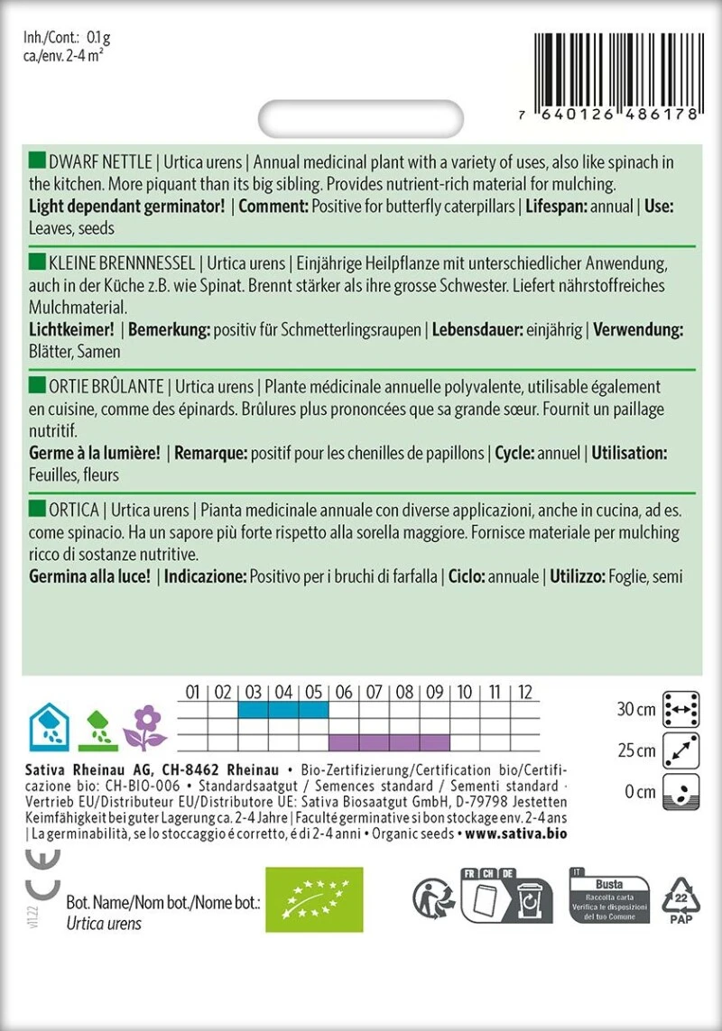 Einjährige Heilpflanze mit unterschiedlicher Anwendung, auch in der Küche z.B. wie Spinat. Brennt stärker als ihre grosse Schwester. Liefert nährstoffreiches Mulchmaterial.